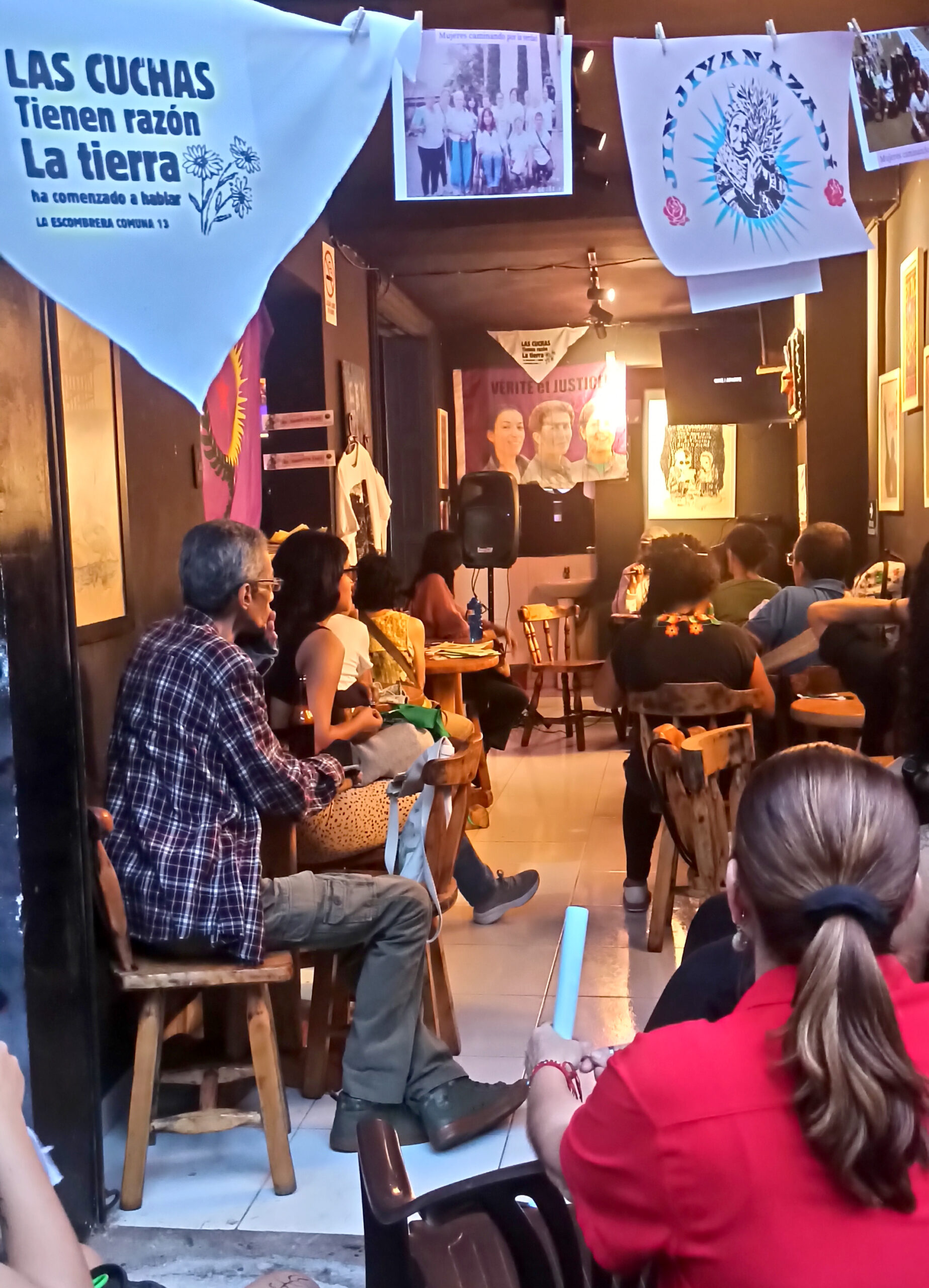 La campaña, que durante 16 días circuló por redes sociales, tuvo su cierre de manera presencial en un evento al que nombramos “Las Cuchas Tienen Razón” el 31 de enero, en el marco del día de acción para la defensa de la revolución de las mujeres de Rojava. Allí, estuvo presente la poeta Luz Elena Salas, una de las madres buscadoras de La Escombrera, ella nos compartió de manera muy sentida sus poemas que hablan de la espera, de su duelo, de su valentía contra el Estado. En las madres resignificamos la verdad y por ello en la actividad también compartimos el Documental “Pañuelos para la Historia”, donde Nora Cortiñas, madre buscadora de la Plaza de Mayo en Argentina, se reúne con las madres de Diyarbakir y las madres de los sábados en Kurdistán, alineando sus voces y luchas en una sola voz, pese a las distancias en geografía e idioma.
