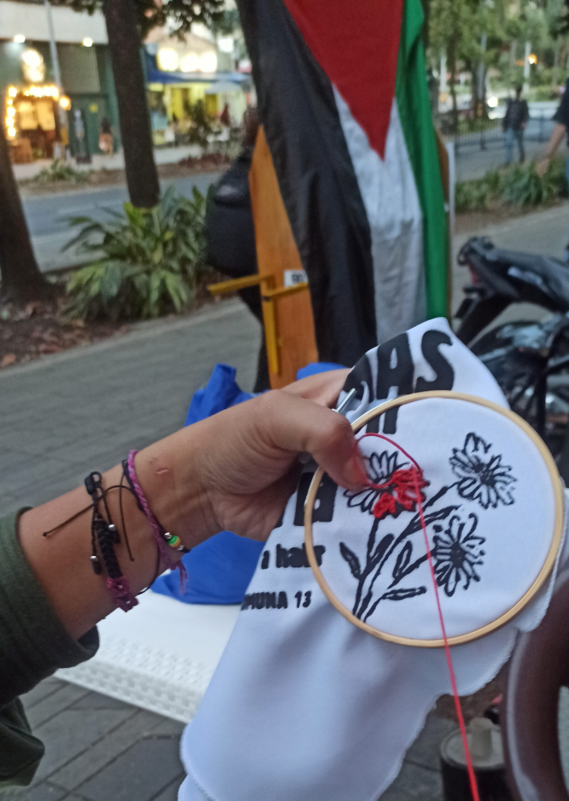 La lucha de las mujeres en Rojava también es nuestra lucha, una lucha de ir caminando y tejiendo solidaridad y construcción glocal de una vida y voluntad libre. Acompañamos también a las Cuchas[3], las abrazamos, bordamos con ella pañuelos como símbolos de resistencia ante una guerra que tampoco cesa en Abya Yala. El Sirirí cantó al unísono de las mayoras, de las madres, de las mujeres que han buscado la verdad. Ellas, como sus hijos desaparecidos, fueron víctimas de las operaciones militares Orión y Mariscal en la comuna 13 de Medellín y sabían que los restos de sus seres queridos reposaban en la Escombrera[4]. Hasta ahora apenas están conociendo y esclareciendo los hechos. La negación de su dolor por parte del estado y la sociedad, las revictimizó.