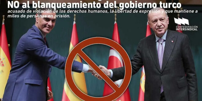 El encuentro Erdoğan-Sánchez se realiza bajo la pretensión del respaldo turco al reconocimiento del Estado palestino por parte del Estado Español. Entendemos que esto no es más que una nueva fase de la política de “blanqueamiento” del gobierno turco acusado en reiteradas ocasiones de llevar a cabo políticas que violan gravemente los derechos humanos, la libertad de expresión y que coarta el derecho de los trabajadores y las trabajadoras a exigir unas mejores condiciones laborales al tiempo que mantiene a miles de personas en prisión.