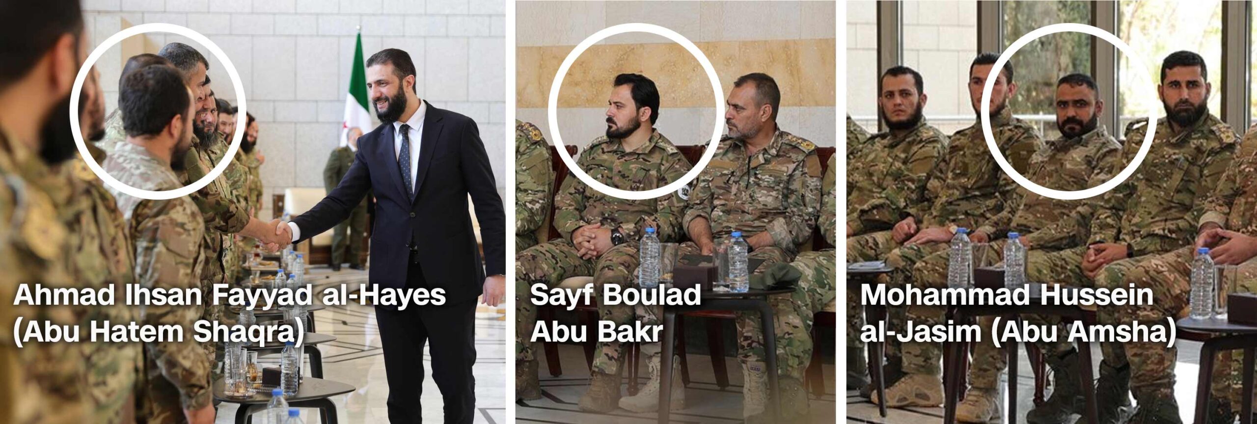 Entre los demás comandantes acusados de abusos en el pasado —incluidos secuestros y extorsiones— que ahora ocupan puestos clave se encuentran Mohammad Hussein al Jasim (conocido como Abu Amsha), jefe de la 62.ª División en la provincia de Hama, y Ahmad Ihsan Fayyad al Hayes, comandante de la 86.ª División en la región oriental del país.