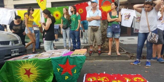 Los kurdos que viven en Argentina armaron un puesto en avenida de Mayo, donde ofrecieron libros y folletos sobre la historia de Kurdistán, la lucha de Abdullah Öcalan y mostraron banderas del KCK, el PJAK y las YPG/YPJ.