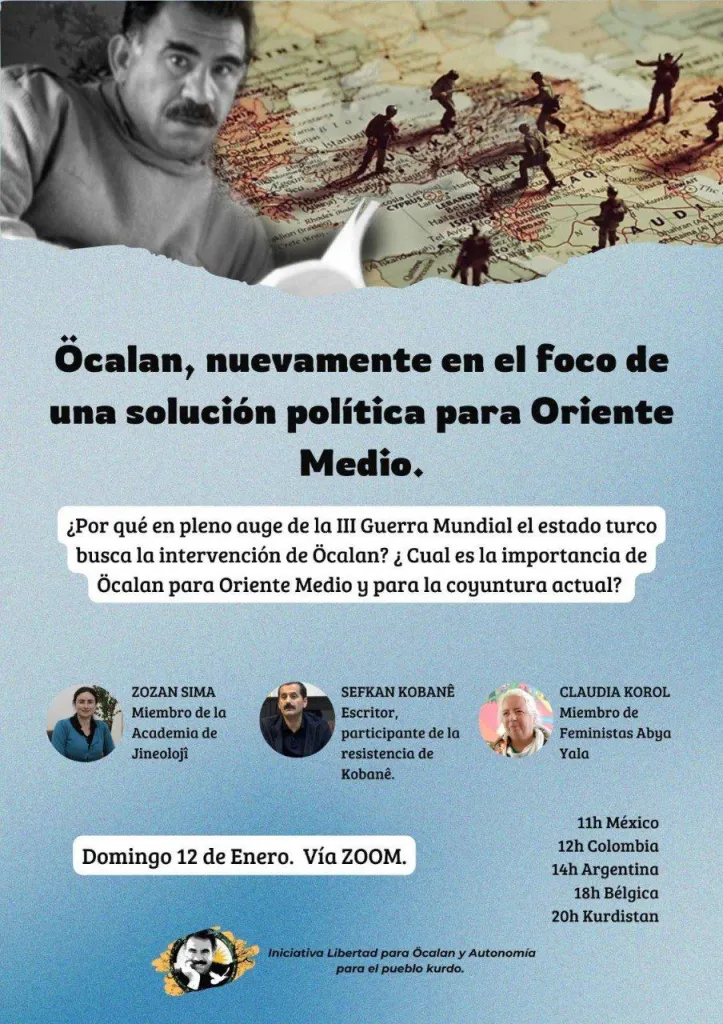 El próximo domingo 12 de enero, la Iniciativa por la Libertad de Öcalan y la Autonomía del pueblo kurdo invita a una charla online, en la que participarán Zozan Sima (integrante de la Academia de Jineoloji), Sefkan Kobane (escritor) y Claudia Korol (miembro de Feministas de Abya Yala).