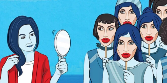 Hoy este ritual se repite con otro marco estético, se representa cada día de nuevo. La mujer quizás ya no salta a un fuego funerario, pero cada día se pone frente al espejo del maquillaje y comienza a convertirse en cenizas. Allí no se mira a sí misma, sino a una imagen alejada de su propia identidad. Su reflejo en el espejo no representa su propio ser, sino un “ideal” moldeado según la aprobación de la sociedad y especialmente de la mirada masculina. Eslóganes bajo el disfraz de libertad como “vístete para ti misma” son en realidad máscaras elegantes de un control interiorizado. Cada elección, aunque aparentemente personal, se realiza dentro de los límites trazados por algoritmos, normas estéticas y filtros de medios digitales.