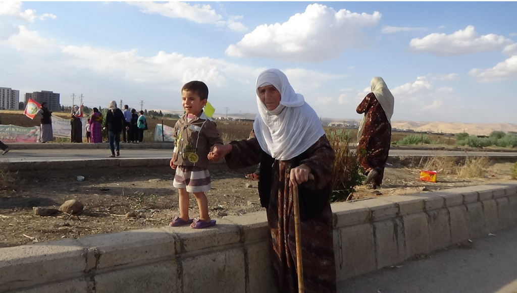 Desde el otro lado de la carretera, una mujer mayor se erguía audaz, mirando a lo lejos, sosteniendo un bastón en una mano y la mano de un niño en la otra. Una vez captada mi atención, supe que tenía que saber más sobre quién era esta mujer y por qué permanecía entre dos fronteras. “Dapîra Nafiya” (Abuela Nafiya) era su nombre; al saludarla, se presentó ante mí como una “hija de Diyarbakir (Amed) de Bakur”, y estaba esperando para salir a trabajar como jornalera en las zonas residenciales locales de Qamişlo.